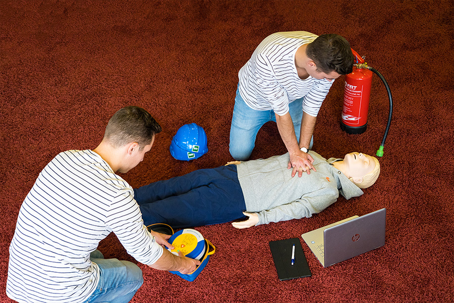 Een gedegen praktijkoefening in levensreddende handelingen waaronder de reanimatie met AED inzet, maar ook leert u met behulp van een LOTUS hoe te handelen bij een flauwte, bewusteloosheid, ernstige bloedingen, welk verband te gebruiken uit de BHV koffer, hoe te handelen bij bijvoorbeeld een onderbeenbreuk, een steekvlam met brandwonden, oogletsel, verslikking, hoe te handelen bij benauwdheidsklachten, hartinfarct, beroerte, epileptische aanvallen of suikerziekte. We hebben zelfs op de 2e etage een auto in ons trainingscentrum speciaal voor oefendoeleinden. In onze verschillende scenario ruimtes staat alles voor u in scène en moet u bij ons echt 112 bellen.