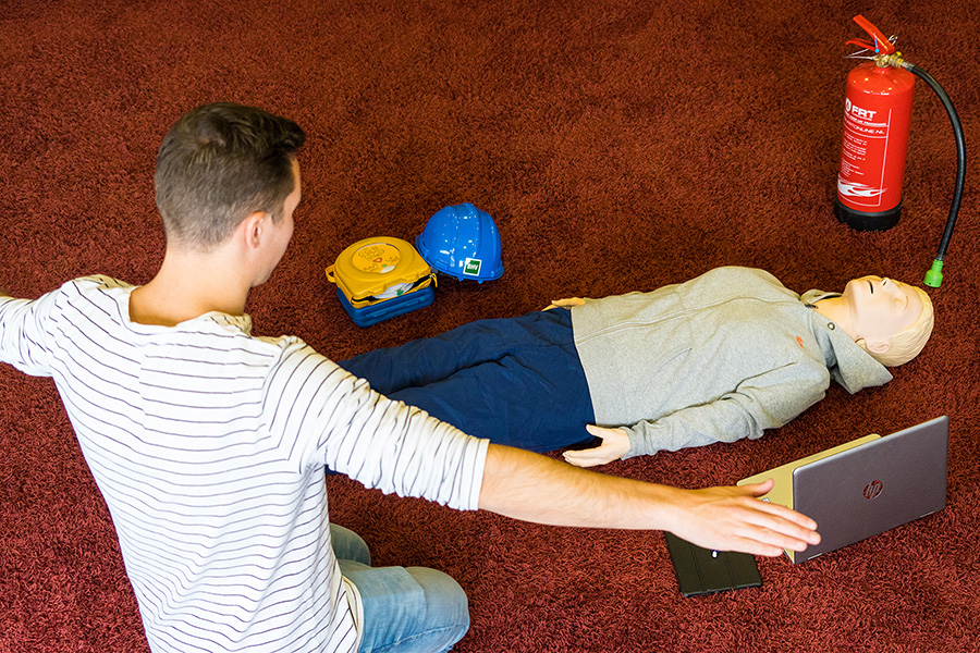 Tijdens de cursusdag Eerste Hulp doet u praktijkoefeningen in levensreddende handelingen, waaronder de reanimatie met AED inzet, maar ook leert u hoe te handelen bij een flauwte, bewusteloosheid, ernstige bloedingen, wanneer welk verband te gebruiken, hoe te handelen bij breuken, kneuzingen, brandwonden, oogletsel, verslikking, shock, angina pectoris, hartinfarct, beroerte, epileptische aanvallen, suikerziekte en een hersenschudding en wanneer 112 bellen en wanneer niet.